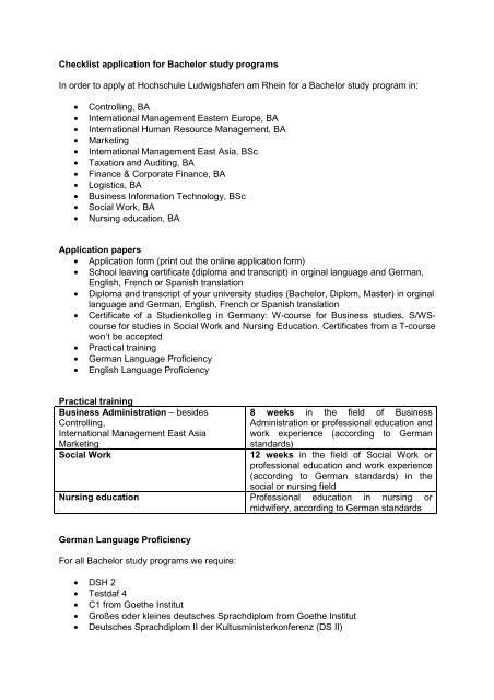 Checklist Application For Bachelor Study Programs Hochschule